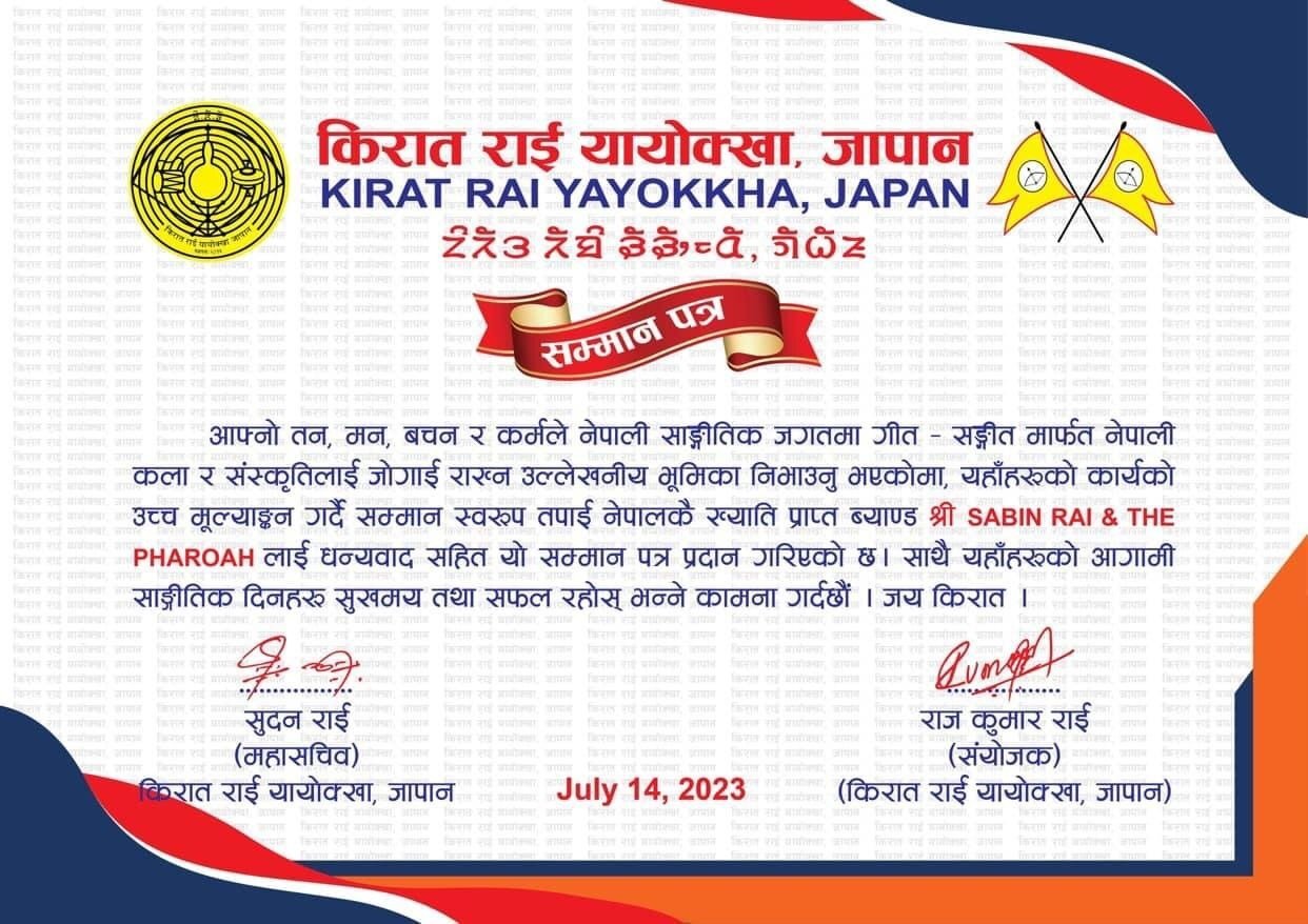 अन्त्यमा यसरी किरात राई यायोक्खा जापानले स्वागत तथा सम्मान गरेकोमा सबिन एण्ड द फारोह को तर्फ बाट धन्यबाद दिदै गितसँगीत मार्फत देशबिदेश मा रहनु भएका नेपाली दाजुभाई दिदीबहिनीहरुलाई निरन्तर देश को सम्झना दिलाउने प्रयत्न गरीरहने बताउनु भयो । यसै सिलसिला मा नमस्ते ब्याण्ड का संस्थापक तथा चर्चित गायक ईश्वर गुरुंगले शुभकामना मन्तब्य दिनु भएको थियो ।
